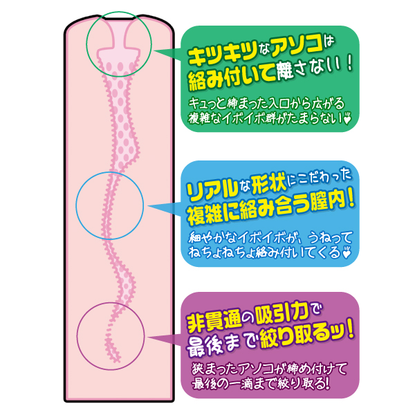 リアルでキツキツなあそこの形状を完全再現!イボがねちょねちょと絡み付くオナホール(非貫通型)。伸縮自在で柔らかく、耐久性も抜群のエラストマー素材を使用!キュッと締まった入り口の奥は、複雑なイボイボ群のたまらない刺激!最奥はさらにキツく締まっており、非貫通型ならではの吸引力で一滴残らず搾り取ってくれます。オナホールのお供にピッタリのCOCOローション(30ml)も付属。