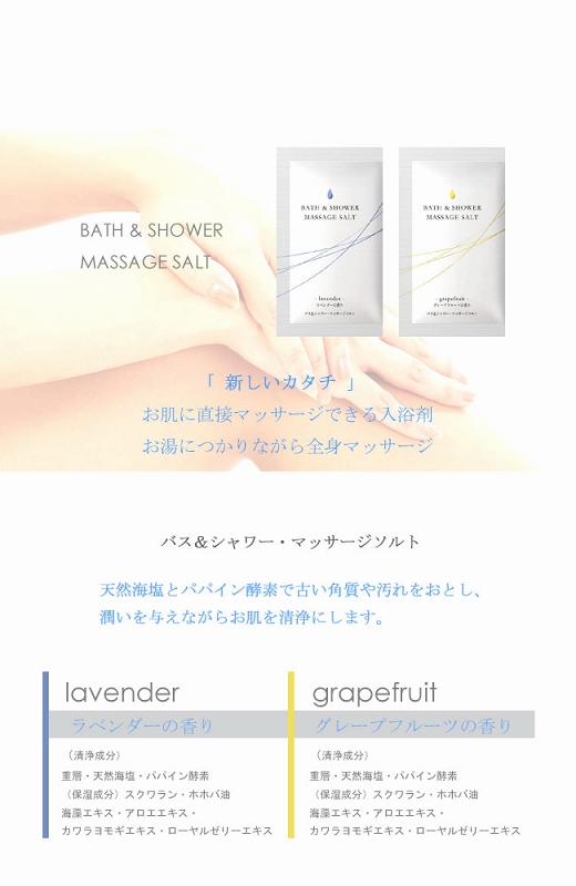 | シャワーだけでもOK!直接マッサージできる入浴剤が登場!お肌をなめらかにひきしめる全身美容マッサージソルト(1回分)。天然海塩とパパイン酵素が古い角質や汚れを落としお肌をひきしめます。さらに6種類の保湿成分を配合し、しっとりなめらかなお肌へと導きます。使用方法はお肌を濡らした後、全身にパックし軽くマッサージして十分に洗い流します。マッサージ後洗い流さずにそのままの入浴も可能!もちろん入浴剤としてもご使用頂けますので、お風呂に浸かりながらの全身マッサージも出来ちゃいます。爽やかなグレープフルーツの香りに包まれながら、素敵なバスタイムをお楽しみ下さい。※お肌をいためる原因になりますので、強くこすりつけないで下さい。頭皮のマッサージにもお使い頂けますが、目に入らないようご注意下さい。   色:  種類:グレープフルーツの香り   仕様:25g(1回分) パッケージ:12.5×7.0cm  | |
