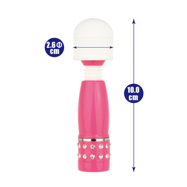 これであなたをお・も・て・な・し!コンパクトなのに超強力パワーを発揮するミニ電マ(ピンク)。持ち手部分は、キラキラストーン付きで女性ウケのいいオシャレな仕上がりになっています。底部を回すだけで動く、誰もが扱いやすいダイヤルスイッチは、無段階調整もラクラクです。また、ヘッド部は上下左右のお好きな方向に曲げられるので、気持ちいいと感じる箇所をピンポイントに刺激できます。生活防水・静音設計、見た目にも使い心地にも申し分のない小型電マです。