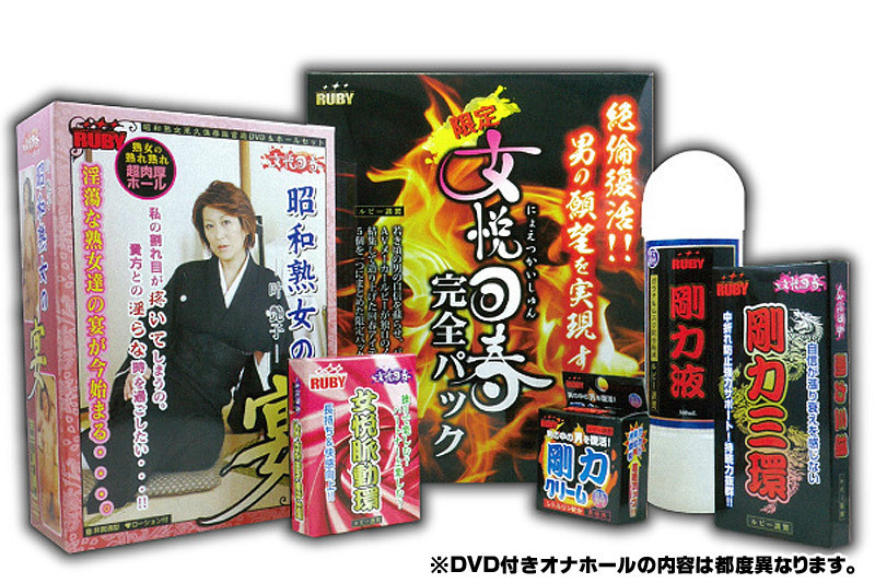 「よかったわ」って言わせたい!ちょっと元気のないペニスを奮い勃たせる特別セット。エロDVD付属で熟女の名器が楽しめるアソートオナホールに、血流をよくする成分シトルリンを配合した「剛力」、滋養強壮効果のあるガラナ&ムスク入りのローション、3点締めで勃起を助けるコックリング、パートナーを快感責めにできる電動コックリング、以上5品を詰め込んだ豪華なボックスセットです。※DVD付きオナホールの内容は都度異なります