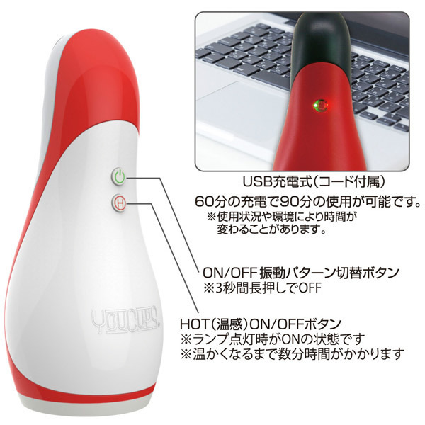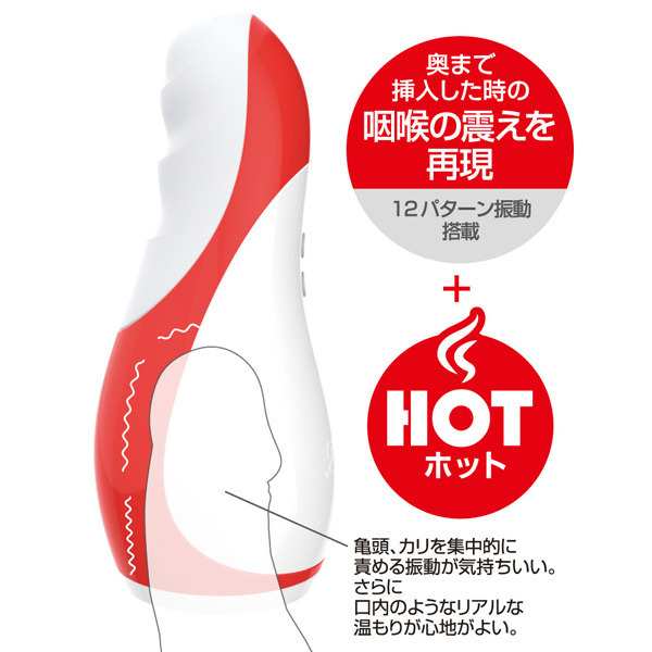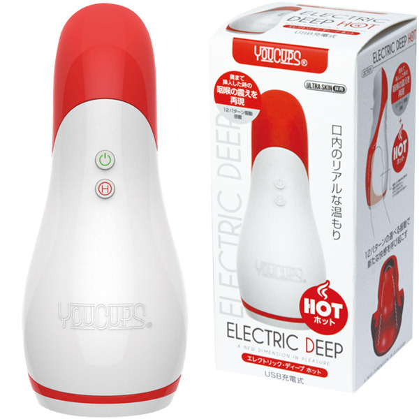 ホットなフェラで極上快感!温もり感じるヒート機能を搭載したエレクトリック ディープ。●イラマチオ系の電動オナホール。●ヒート機能で口内の温もりを再現。●凹凸のないツルンと滑らか構造。●喉奥が締まるディープスロート感。●12パターンの振動機能を搭載。●奥まで挿れた際の咽喉の震えも再現。●亀頭&カリをダイレクトに刺激。●USB充電コード、5mlローション付属。亀頭派の方におすすめ!グローバルなセックストイブランド「YOUCUPS」のホットに感じるフェラチオホール。「エレクトリック ディープ」は内部を敢えてシンプルにしたことで密着感が高まり、ダイレクトに刺激と温もりが伝わる快感構造になっています。