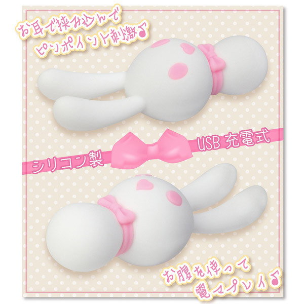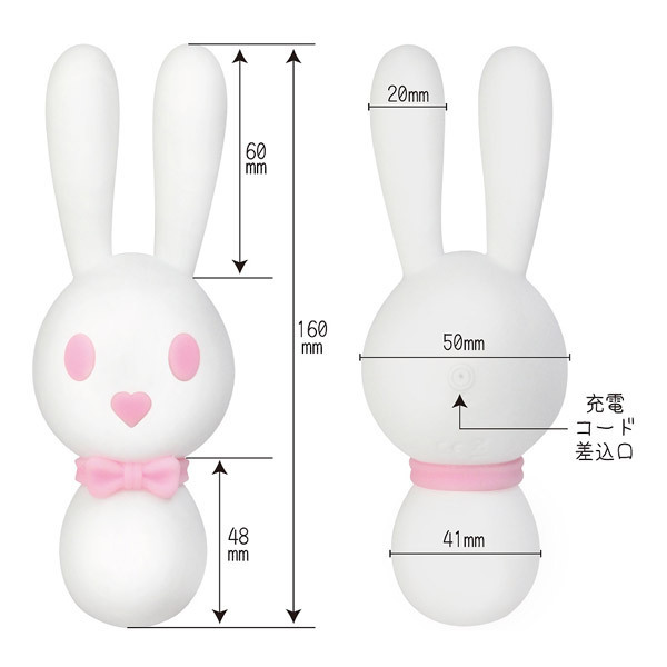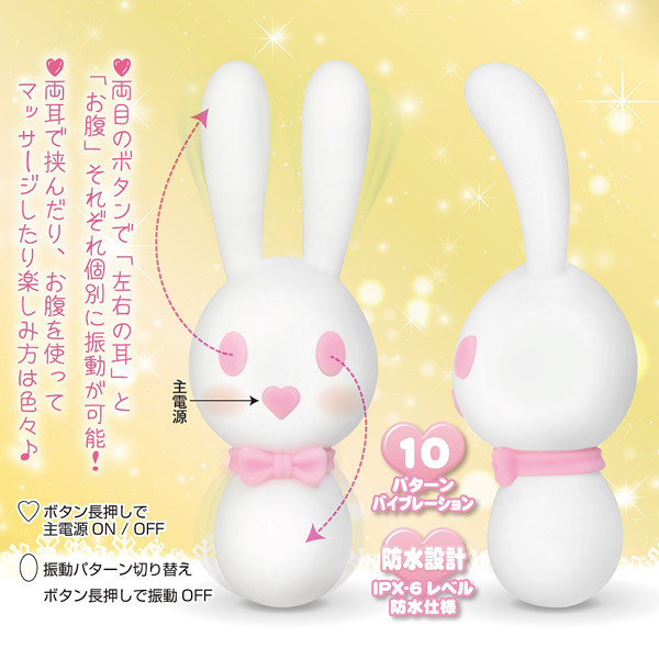 白くてかわいい♪シリコン製のウサギ型ハンディマッサージャー「白うさこ」。ボディには滑らかな肌触りのシリコン素材を採用。可愛らしい見た目でも振動はとっても強力!両耳の先端とお腹の計3ヶ所に10パターンのバイブレーション機能を備えた強力モーターを搭載。ハートのお鼻でスイッチON!両目のボタンで両耳とお腹の振動をそれぞれ個別に操作可能です。両方のお耳で挟み込んでピンポイント刺激したり、お腹部分を使えばデンマプレイもできちゃうアニマルローター。お風呂でも使えるIPX-6レベルの防水仕様なので丸洗いも出来ます。USB充電式(コード付属)。振動中&充電中はほっぺが可愛く光ります。