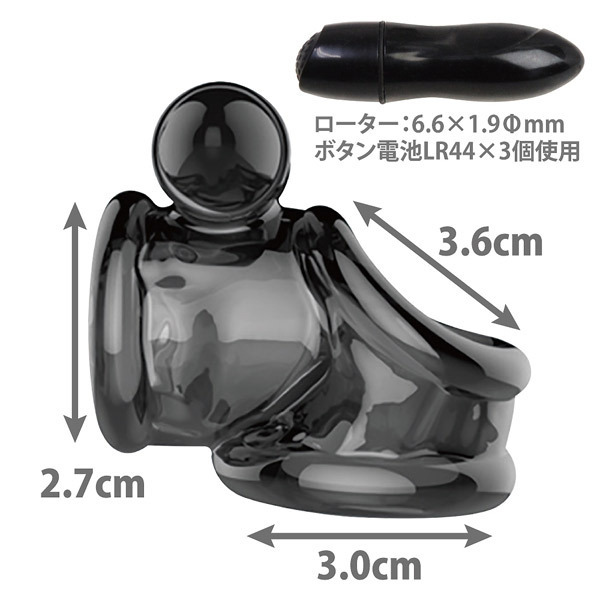 パッケージ:10.0×7.3×5.3cm 本体:リング内径(竿部分2.7cm・玉袋3.0cm・根本3.6cm)・ローター6.6×1.9cm 重量:56g 電池:ボタン電池(LR44)×3個使用
