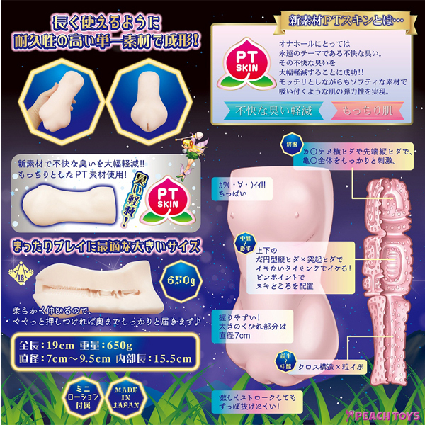 柔らかなヒダに600粒のイボイボがびっしりと絡みつき奥は迷宮のように複雑でベローンとした高さのあるヒダヒダが待ち受けます!もっちりとしながらもソフティな素材感で吸い付くような肌の弾力を実現。まったり派もなっとくの、優しく包み込まれる快感♪