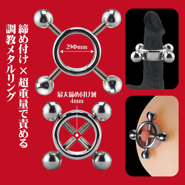 4つの方向からネジで挟み込み締め上げる!約180gの重厚感溢れるステンレス製メタルリング。男性器から乳首まで約2.9cmから4mm幅まで対応可能♪鬼のような締め付けと超重量で徹底的に調教する!