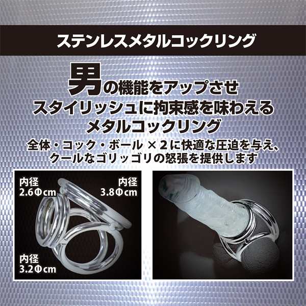 男の機能をスタイリッシュにサポートする金属製のコックリング。男性器の根元3箇所を程よく圧迫!男性補助をするだけでなく拘束感も味わえるメタル製のコックリング。