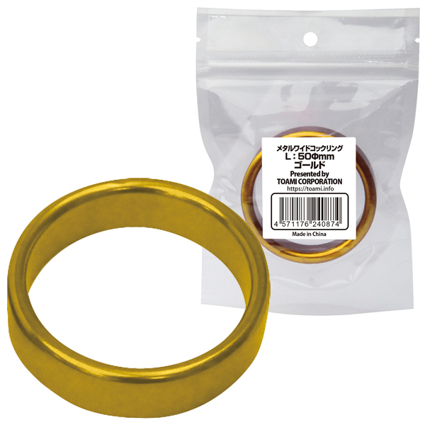 象徴を目立たせるアルミニウム合金製のお洒落なコックリング(ゴールド)。金色のゴージャスな輝きとメタリックの光沢感が相まって圧倒的存在感を放つ!男の自信を覚醒させるワイドタイプのコックリングです。吊り穴付きの透明パッケージ入り