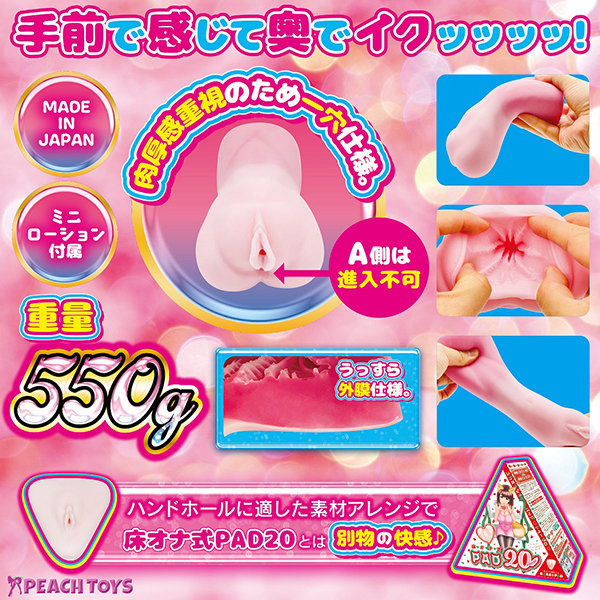 床オナ式シリーズ最新作は手前で感じて奥でイクッ!前作「床オナ式PAD20(b30357)」のハンディサイズが欲しいという声から生まれた肉厚550gの非貫通オナホ。肉厚感を重視し一穴で設計!前半3分の2は桜色の絡むように柔らかい素材を、残りの部分には高弾力な素材を使用したハイブリッド仕様♪素材の質感とヒダ模様で的確に刺激します。ローション付き