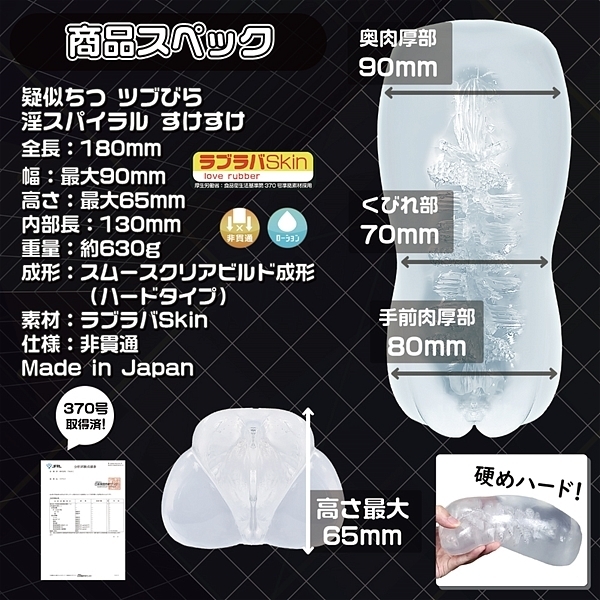630gの極まる肉厚!奥に行けば行くほど肉厚になる希少な壷状肉厚構造!ねじれた高ヒダに細かなツブツブが刺激となりながら最奥部の子宮口で絞りとります。「すけすけ」は固めの硬度で設定されているので強めの刺激を求めている方に最適!厚労省、食品衛生基準第370号準拠素材のラブラバSkinを採用しているので安心してご使用して頂けます。