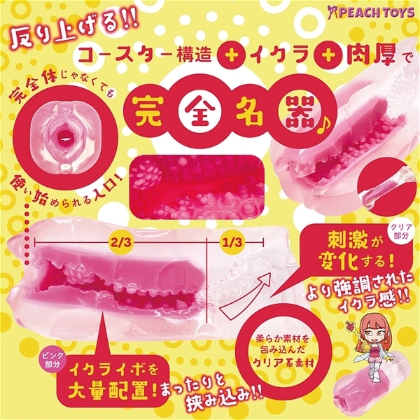 無数のイクラでプリクニュッ!カズノコサンドの粒イボではない、イクラのような大きさのイボを使用。イボは柔らかな素材を使用し、外を硬めの素材が包み込むため独特の使用感を感じることが出来ます。入口から2/3は比較的まったりでまるでフ〇ラのような優しい独特の感触ですが最後の1/3はフィニッシュのためにしっかりとした刺激を感じ取れるように外側と同素材になっています。