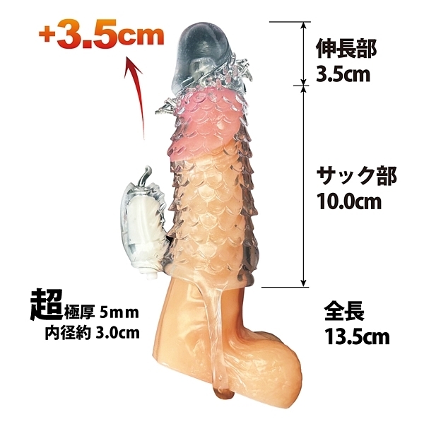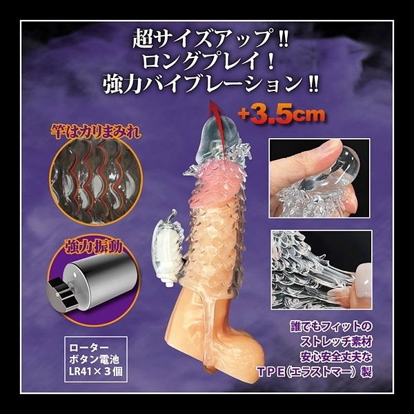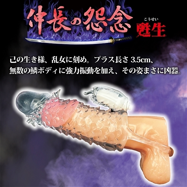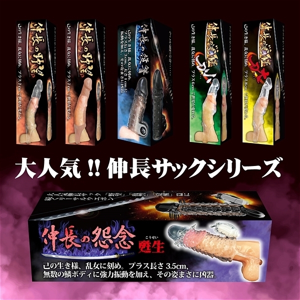 突如姿を消した伸長の怨念が、再び現世へと戻ってくる…。大人気伸長シリーズで惜しまれ販売終了した伸長の怨念が装い新たに新登場!己の生き様、乱女に刻め。プラス長さ3.5cm、太さ1cmに強力振動を加え、その姿まさに凶器!超サイズアップ!!ロングプレイ!ウロコ状のボディは超刺激的!誰でもフィットのストレッチ素材。安心安全丈夫なTPE(エラストマー)製