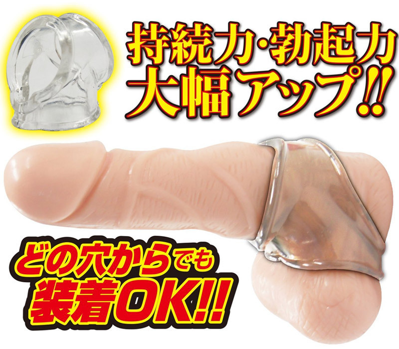 根元をダブルで締め付けて眠った男の底力をUP!三方向どこからでも装着できる透明コックリング。伸縮性に富んだ素材で装着もスムーズな上、最大内径30mmでも性器サイズを問わずにぴったりとフィット!どの穴からも通せますが、内径25mmのトンネルには尿道ポケットつきなので圧迫感なく装着できます。ロングプレイも夢じゃない、男をアゲる男性用補助グッズです。