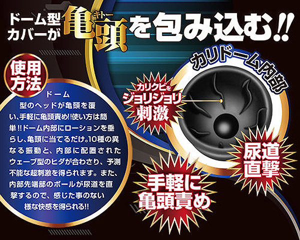亀頭に被せてグリグリ回すだけ!カリ首責めから尿道責めまで同時にできる電動オナグッズ。●ハンドベルのようなボディ形状●ローションを少量塗布して亀頭へすっぽり被せたら準備完了●ワンプッシュで10種の振動パターンを操作可能●ドーム内の波打つヒダが亀頭を360度くまなく刺激●内部先端のボールで尿道刺激もお手の物。強力振動とヒダの生み出す超快感に思わずハマる!持ち手を両手でグリグリと回せば、更なる快感も得られる亀頭責めグッズです。