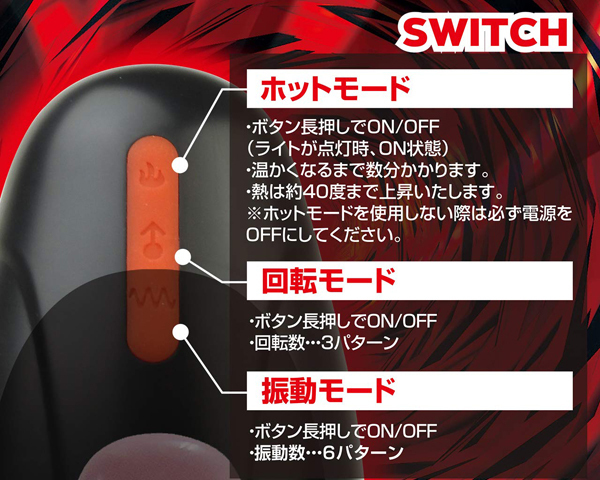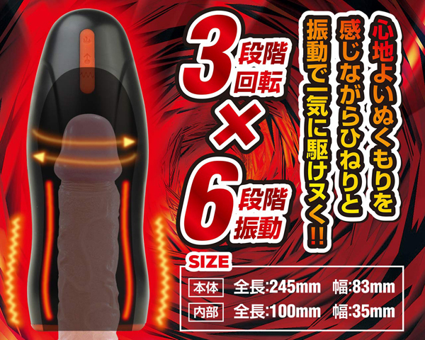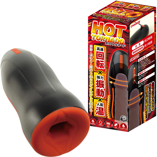 膣のぬくもり×内部のうねり×全体へ伝わる振動…女性器で感じることのできる感覚をすべて兼ね備えたホットトルネードが、電動オナホールに嵐を巻き起こす!!オナマシーンはここまで来た!!電源を入れて挿入すれば、ボタンを押すだけで快楽へ導く刺激を楽しめる。心地よいぬくもりを感じながら、ひねりと振動で一気に駆けヌケろ!!【ホットモード】ボタンを押せば、熱が約40度まで上昇。膣内のぬくもりを楽しめる。【回転モード】3パターンの回転で、膣の内部のうねりを楽しめる。【振動モード】6パターンの振動で、女性が絶頂に達する際の震えを楽しめる。USB充電式・生活防水