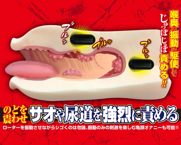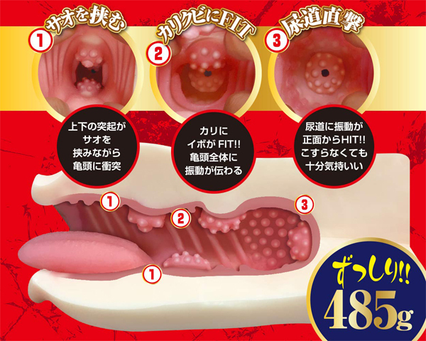 のどを震わせサオや尿道を強烈に責める!!最強のフェラ技「口蓋振(こうがいしん)」を楽しめるフェラホール!ローターを振動させながらシゴくのは勿論、振動のみの刺激を楽しむ亀頭オナニーも可能!!奥まで挿入すれば亀頭をロックしながら尿道に振動が直撃しストロークしなくても超気持ちいい!重量が485gあるので口に本当に頬張られているような圧迫感で満たされながら振動を楽しめる。亀頭ローターとフェラホールのいいとこどりな深い快感をサオ全体で楽しもう!!【口蓋振とは?】のどちんこを震わせながら尿道や裏スジを責めるフェラの最終奥義とも言われる上級者のテクニック。口蓋振を会得するにはそれ相応の修業が必要らしい…