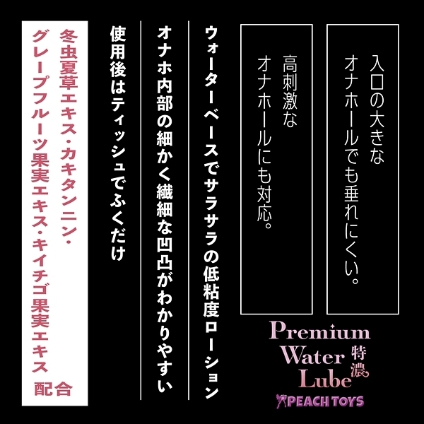 『水のように滑らか、でもヌルヌル感持続!ふき取るだけでOK!』「ふくだけローションPremium Water Lube (180ml)」が、ラベルデザインと容量・成分をリニューアルして再登場です!白いポンプの「ふくだけPWL 特濃」は、【低粘度+濃厚な液体】入口の大きなオナホールでも垂れにくい。高刺激なオナホールにも対応。冬虫夏草エキス・カキタンニン・グレープフルーツ果実エキス・キイチゴ果実エキス配合●ウォーターベースでサラサラの超低粘度ローション●オナホ内部の細かく繊細な凹凸がわかりやすい●使用後はティッシュでふくだけ簡単●無香料●安心の日本製●200ml 特濃 <成分>水、プロパンジオール、ヒドロキシエチルセルロース、乳酸、キサンタンガム、ローヤルゼリーエキス、アルギニン、マカエキス、水溶性コラーゲン、グリチルリチン酸2K、ローズマリーエキス、モモ葉エキス、カキタンニン、銀、フユムシナツクサタケエキス、クエン酸、クエン酸Na、BG、エタノール、セルロースガム、炭酸水素Na、フェノキシエタノール、EDTA-2Na、ブチルカルバミン酸ヨウ化プロピニル