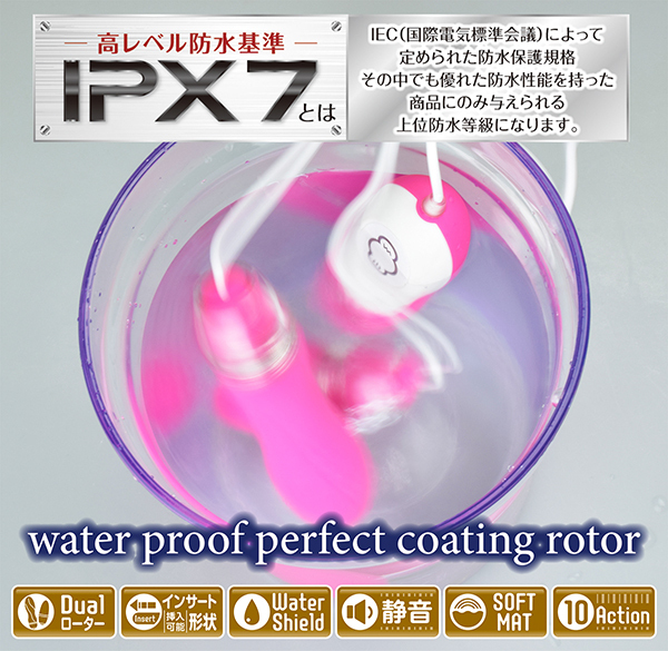 なんと30分間水没させても浸水しないという、国際基準IPX7をクリアした驚異の防水性能を誇るダブルローターです。挿入して楽しめるインサートスタイルと、ピンポイントに当てて楽しめるスポットスタイルのヘッドは、それぞれ形が異なるのでクリに当てながら挿入したりといった使い方も可能♪振動パターンは10種類でトルクフルな強力振動はきっとクセになること間違いなし!肌触りの良いさらさらマット加工は、女性が心地よく感じること請け合いで、最新技術のウォーターシールド加工が施されているから、本体もコントローラーも水に入れても浸水しませんよ♪こちらは人気のピンクカラーになります。※単四電池×2本付属