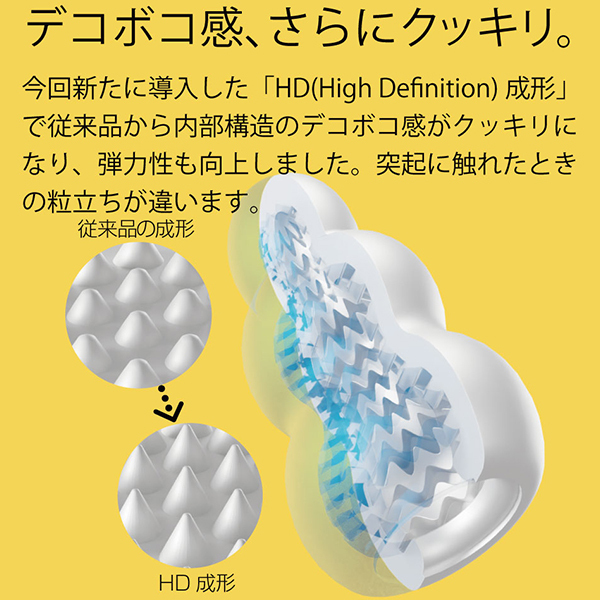 全てが新しくなったプッチ。ポケットサイズのローション不要ホールプッチシリーズが生まれ変わって新登場。軟性素材から内部の構造、パッケージ、全てが新しくなりました。デコボコ感、さらにクッキリ。今回新たに導入した「HD(High Definition)成形」で突起のデコボコ感がさらにクッキリになりました。突起に触れたときの粒立ちが違います。弾力感、さらにモッチリ。「HD 成形」により軟性樹脂の弾力性も向上。さらにモッチモチに、しなやかな素材になりました。内部構造も、さらにハッキリ。オリジナルシリーズ、スイーツシリーズ計8種類の内部構造をより精密な造形にリニューアル。「HD 成形」とあいまってデコボコ感がよりハッキリわかる構造になりました。生産工場を一新。新型プッチシリーズは日本国内に新設した工場から生産。最新の設備と厳密な品質管理で一つ一つ丁寧に作ります。ローション不要、必要なのは水だけ。ローション不要軟性素材「プラスウェッチ」水分が付着すると潤い成分が反応、ねっとりした潤いに包まれます。<キャンディー内部構造>「密集した四角錐の高刺激」整然と敷き詰められた四角錘の突起<クリーム内部構造>「吸い込まれるトルネード構造」斜めに擦り上げてくるヒダはクリームのように昇りつめる絶頂感<ベリー内部構造>「全体を覆う繊細で優しい突起」フワフワとした起毛が包み込みまったりしたなめらかな触感<カカオ内部構造>「反り返りのあるヒダの多層構造」ビッシリ並んだヒダは反発しながら複雑に絡みつく刺激