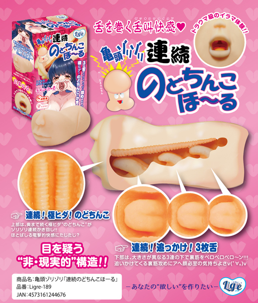 肉厚でBIGサイズ!トラウマ級のイラマチオが体験できる亀頭ゾリゾリ「連続のどちんこほーる」の登場です。喉の奥までズッポズポ!挿入すると3枚の舌が裏筋を3回ゾリゾリっと刺激する♪肉厚素材でプレミアムローション付きの非貫通オナホール!のどちんこでかき回す舌叫快感をぜひお楽しみください。