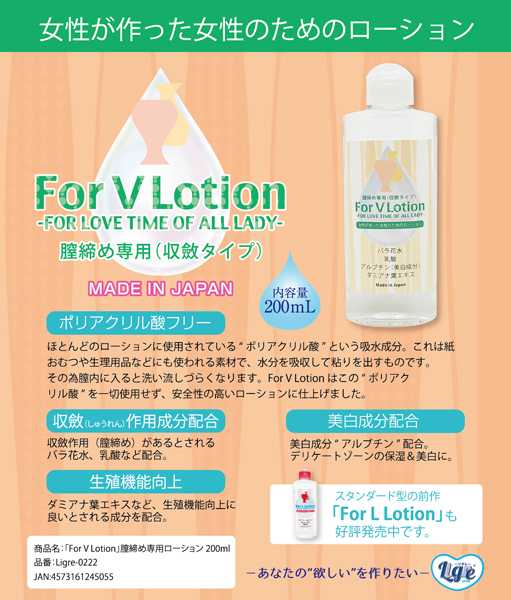 バラ花水、乳酸、アルブチン(美白成分)、ダミアナ葉エキスなど美白効果が期待できそうな良成分がしっかり入った「For V Lotion 200ml」。女性が作った女性のためのローションで、美白ケアやスペシャルな女性を目指したいときに♪