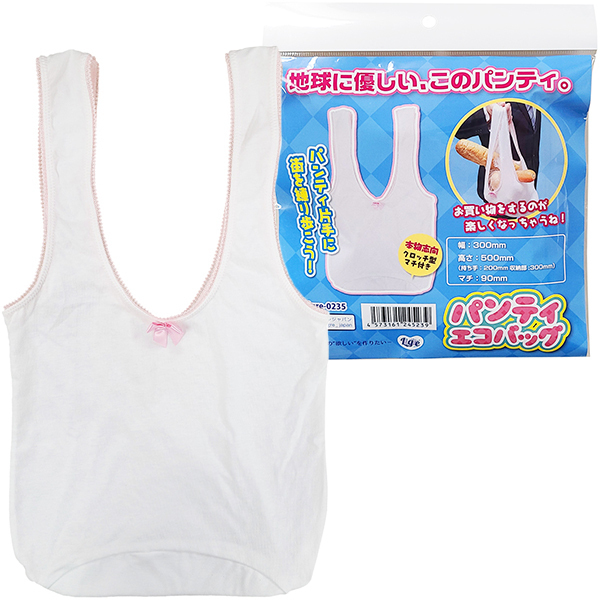 パンティ片手に街を練り歩く!?誰かとすれ違いざまに思わずドキッとさせてしまう「なんだかパンティっぽい見た目」が特徴のジョーク系グッズ「パンティエコバッグ」です。小さいリボンの装飾がそれっぽく、股間部分はクロッチになっているのもポイントです♪ジョークグッズとしてプレゼントやイベントの景品としてもどうぞ。