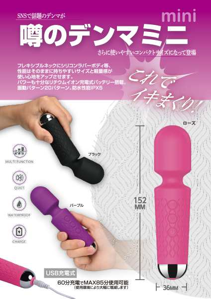ネットや動画などで使われていてよく見る話題のデンマが、さらに使いやすいコンパクトサイズになって登場!フレキシブルネックにシリコンラバーボディ等、性能はそのままに、持ちやすいサイズと軽量感が使い心地をさらにアップさせました♪パワーも十分なリチウムイオン充電式バッテリーを搭載し、60分の充電で最大85分の使用が可能。(使用環境により大幅に増減します)。振動パターンは20パターンを搭載し、防水性能IPX5となっています♪3種類のカラーバリエーション展開でこちらはパープルとなっています。