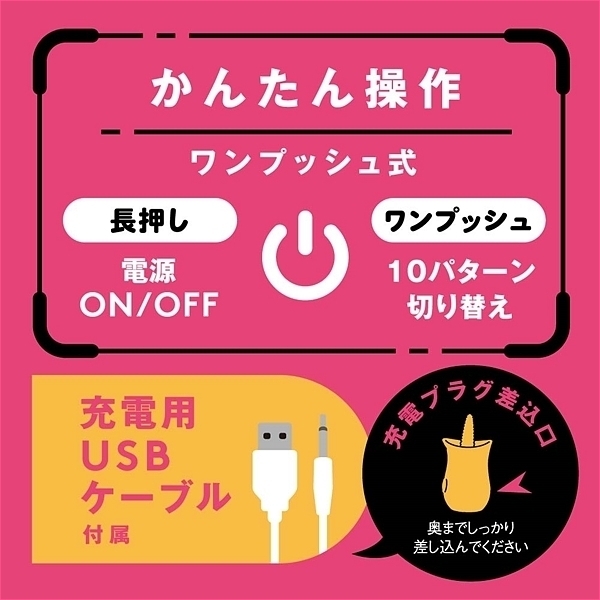 高速舌舐めローターでクンニイキ&チクビイキ!高品質ソフトシリコンを使用した肉厚舌は、もっちり弾力で、表面のツブツブがとても刺激的!ちょうどいいサイズ感の舌は、中も外もイケる万能舌です。マンネリしない多彩な高速ペロペロ10パターン!最大毎分約150回の高速ペロペロ!防水機能IPX6等級。静音設計 ≦60dB。●カラー:ブラック