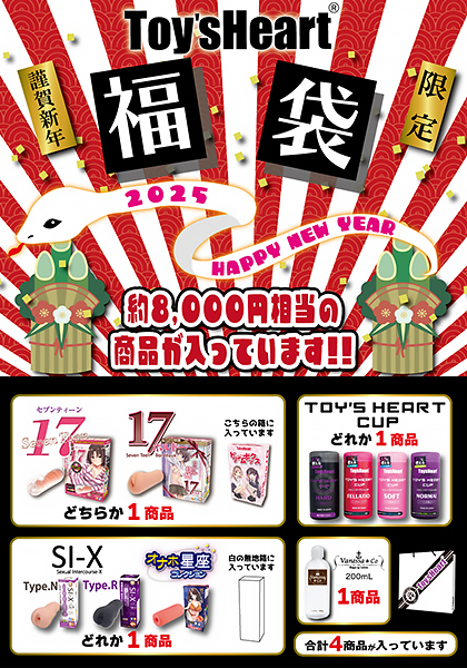 総額8000円相当!大人気のトイズハート製品をたっぷり詰め込んだ超豪華な福袋を、完全数量限定【2700円】で販売中です。オナホール3点とローションが1点、どんな商品が届くかは開けてからのお楽しみ♪特製バッグに詰めてお届けします。こちらは大サービス商品の為、ご注文はお一人様1袋限りとさせていただきます。