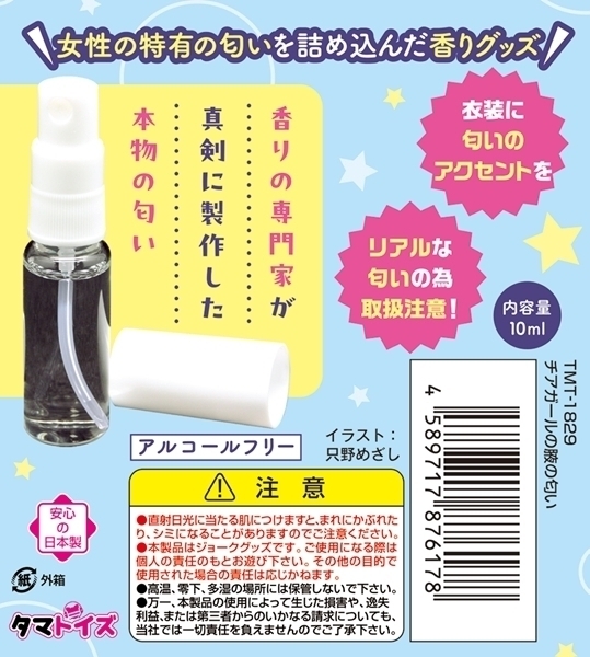 爽やかで甘い香りを再現したアルコールフリーの香水です♪日本製の高品質な製造で、安心して使える仕様になっています!内容量は10mlで、コンパクトなサイズ感が持ち運びにも便利♪お部屋や衣類に軽く吹きかければ、心地よい香りが広がります!空間をリフレッシュしたい時や、特別なリラックスタイムにもぴったりです♪イラストは只野めざしが手掛けており、パッケージデザインも楽しめます!フェチグッズとしても人気の高い一品♪ぜひ特別な香りを体験してみてください!