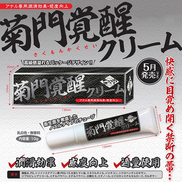菊門覚醒クリームが新登場!潤滑と抗菌を両立した乳白色で無香料タイプのクリームで、潤滑効果と共に感度アップもサポート。衛生面を考慮したノズルチューブタイプなので使いたいところにすぐに注入でき、手早く塗布したりもできて便利!お菊さんも上機嫌です♪