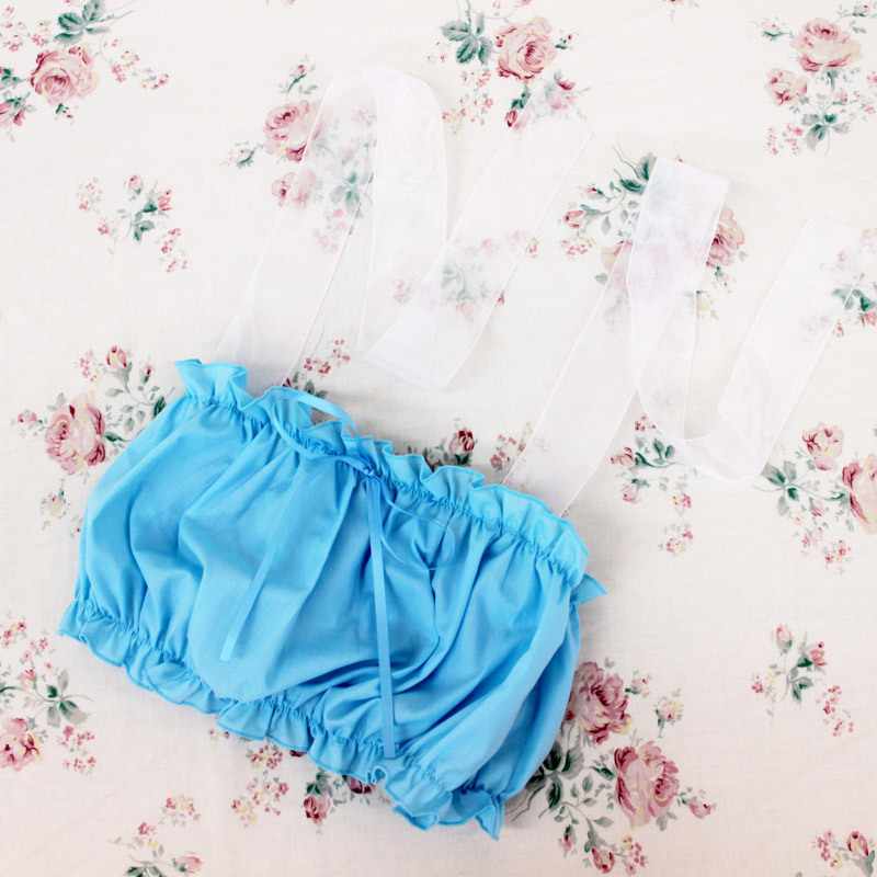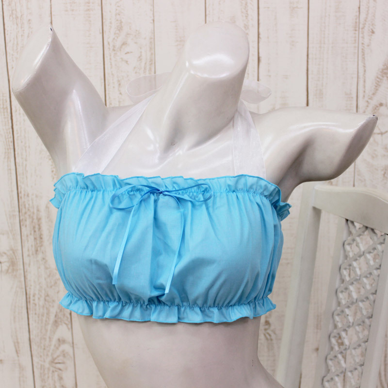 ふわふわ可愛い♪乙女チックなチューブタイプのブラジャー。●鮮やかパステルブルー×ホワイト●上下にたっぷりフリルギャザー●胸の真ん中に繊細なリボン付き●すっぽりかぶるだけの簡単装着●首元は可愛いレースリボン。ホルターネックデザインの可愛いブラが誕生!鮮やかなブルーに透け感たっぷりのレースリボンが乙女度をグンとUPさせてくれる女性用ランジェリーです。お揃いのショーツ(cm0998)もあわせてどうぞ。※水洗い不可、塩素系漂白剤による漂白不可、アイロンは中温で当て布使用、ドライクリーニング可。※こちらの商品は在庫の状況によりお届けまでに4日〜7日程度かかる場合がございます。