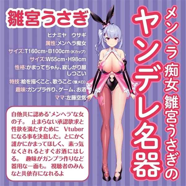 人気VTuberでメンヘラ痴女でもある雛宮うさぎのヤンデレ名器をイメージした非貫通型オナホ「雛宮メンタルクリニック 雛宮うさぎ」です。マッタリゆるふわな癒し系の名器で敏感部分に絡みつく柔らかな膣壁と膣内の空間が柔らかく包み込む感じがたまらない♪いやらしい膣ヒダがむっちりと貴方に抱きつき離さない!奥にいくほど押し寄せてくる濃厚な肉厚感はユルふわで、まるで3LDKのような膣内が特徴的♪これはもうみんなで共依存するしかない!うさぎのことだけ考えてシコってね♪ローション付き●メーカー型番:TMT-1619