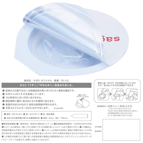 HOME> コンドーム・避妊具 > 薄い・厚い(早漏防止) > サガミ サガミオリジナル002 (20コ入り)
