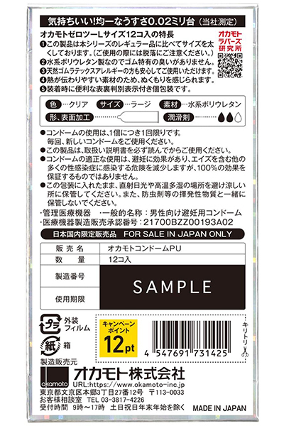 HOME> コンドーム・避妊具 > S・L(特大)サイズ > オカモトゼロツー うすさ均一0.02 Lサイズ(12個入り)