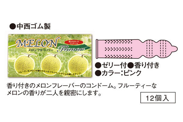 思わず食べてしまいたくなる?甘いメロンの香り付きコンドーム「メロンフレーバーコンドーム 12個入り」。フルーツの香りが付いた潤滑剤ゼリー加工で潤滑作用も抜群!フルーティーなメロンの香りでラブタイムをさらに楽しく彩る、ピンクカラーの二段絞りタイプコンドームです。