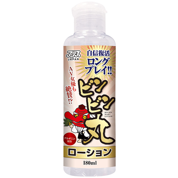 クリーム、ジェル、ドリンクなど好評を博すシリーズ・ビンビン丸より、ついにローションが登場。オーソドックスな高級品質ローションにアルギニン、シトルリンを配合。適度な潤滑で気持ちがいいと同時に、男の自信を取り戻す機能性ローション。マンネリ打破を目指し、セックスシーンで大活躍。容量は180ml。