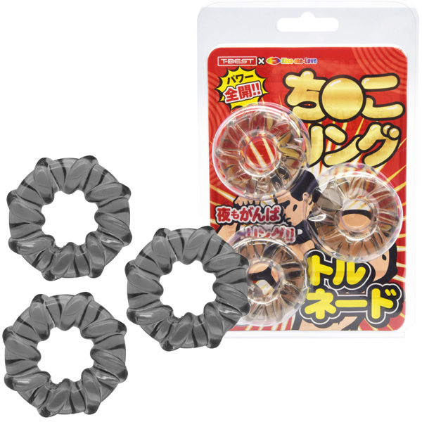 <T-BEST×KISS-ME-LOVE>夜もがんばリングで大人気のやわらかメンズリング「ち●こリング」が、トルネードになって新登場!今度のち●こリングは「特殊形状3個セット」!トルネードデザインのリングを3つもセットにしました!うずまき状に巻き付いた凹凸が伸縮率を高めてより効率的な装着感を生み出します。合わせて使えば三点同時装着が可能となります!高い耐久性のやわらかエラストマー素材に引っ張りやすい簡単装着デザイン男らしさを引き立たせるスモークカラー!締め付け抜群みなぎるパワー!