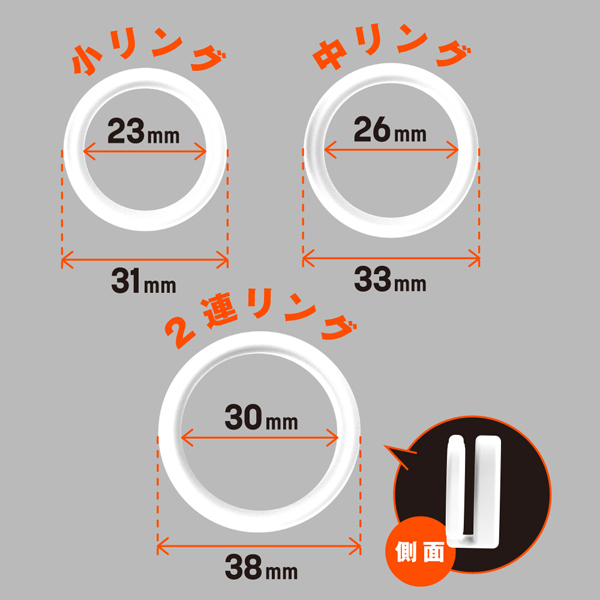 パッケージ:10.5×6.5×5.0cm 本体:小リング(内径2.3cm・幅0.6cm)・中リング(内径2.6cm・幅0.6cm)・2連リング(内径3.0cm・幅0.5cm/0.8cm)・4段階調整リング(13.4cm・幅0.5cm) 重量:13g(小1g・中2g・2連リング5g・4段階調整リング5g)