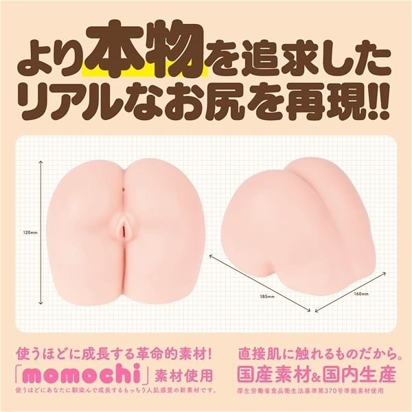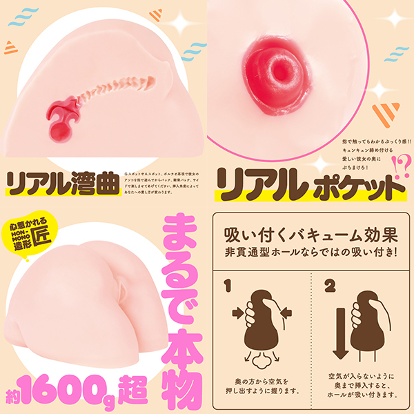 愛される女の子のお尻を再現しました。より本物を追求したリアルなお尻を、心惹かれるHON−MONO造形で再現し、ノーハンドでも楽しめる臨場感あるホールに!!平均サイズ、GスポットとAスポット、リアルに当たるポルチオ角度、波打つ肉壁、素材もこだわった「ふんわり柔肌、とろける生の感触、生の肉厚」。据え置き型で重量約1600g超の特大サイズ!!直接肌に触れるものだから、国産素材&国内生産。イラスト:紅林のえ