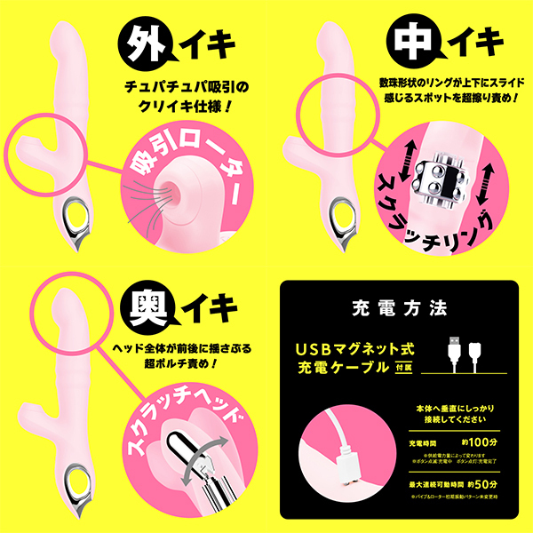 気持ちイイとこ全部責め♪究極ギミック搭載で奥イキ・中イキ・外イキ革命!ヘッドが前後に揺さぶり超ポルチ責めするスクラッチヘッドギミック!数珠形状のリングが上下にスライドし、感じるスポットを超擦り責めするスクラッチリングギミック!チュパチュパ吸引でクリイキ仕様の吸引ローター!バイブ振動10種類に吸引ローター10種類、ギミックパターンが5種類で脅威の全500バリエーションで楽しめます。超強力重厚モーター で芯から震える重くて強烈な振動!肌ざわりなめらかな高品質ソフトシリコン仕様です。本体は充電式なのでエコに使用可能。本体:充電時間約100分※本体:最大連続稼働時間約50分(初期振動パターン未変更時)_IPX6等級_バイブ・ローター各10パターン振動_ギミック5パターン可動_付属品:USBマグネット式充電ケーブル※IPX6:放水ノズルを使って噴流水を最低3分間あてる試験(浸水は不可となります)●カラー:ピンク
