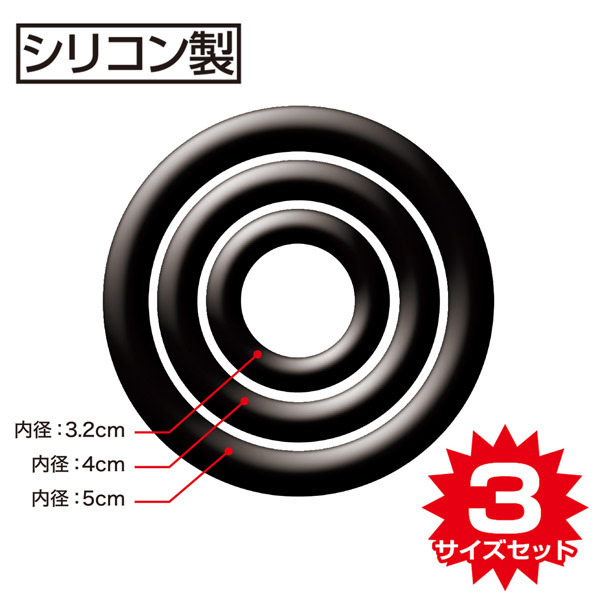 デキる男の変身アイテム!高級シリコン製コックリング3サイズセット「パワーリングDX ブラック」。●サイズの異なる黒リング3個セット●内径:大5cm・中4cm・小3.2cm●高品質なシリコン素材を使用●伸縮自在で肌触りも良く装着感抜群。お肌に優しい自然な感触!サイズやお好みに応じて3サイズを使い分けられる高品質シリコン製のペニスリング3個セット。カリ首や根元などお好きな部位に装着することで、様々な刺激を楽しめる男性用補助グッズです。