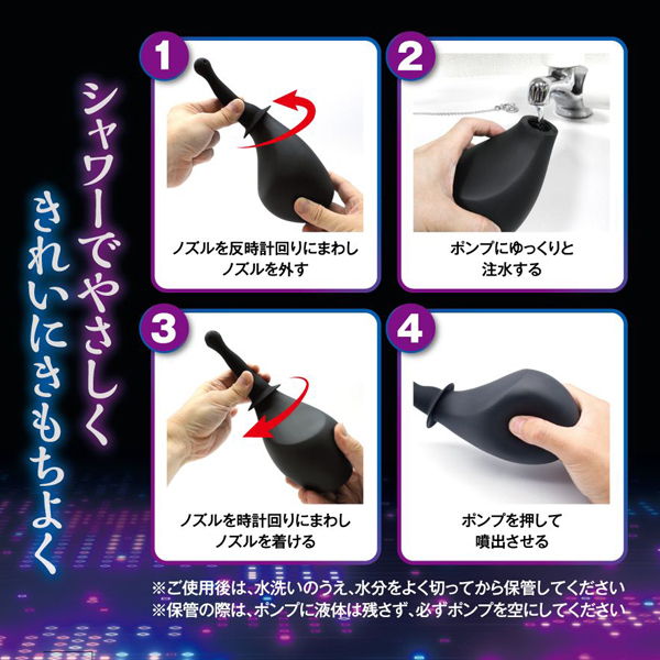 シャワーでやさしくきれいにきもちよく。アナルほか噴出洗浄器「エイナスシャワー」!ラブ・ライフにぴったりな多目的洗浄器が新登場。大容量360ミリのポンプに水を入れれば、先端ノズルの四方の穴からビュビューッと噴出できちゃいます!先端ノズルは、差し込んで使えるように、硬めのハードシリコン仕様。ポンプは、水を押し出すように、ふんわり柔らかなソフトPVC素材!ノズルとポンプは分割可能なので、注水やお手入れも簡単です。いろいろ使える噴出ポンプなので、アナルやアソコの洗浄はもちろん、オナホの内部洗浄もOK!中に液体を変えれば、ローション注入器や洗浄液注入器とも使えちゃう!